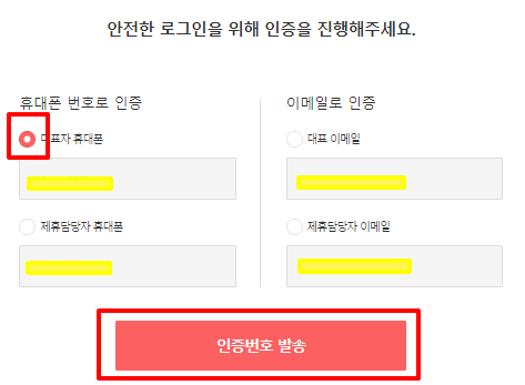 대표자님의 번호를 선택하고 [인증번호 발송]을 누릅니다.