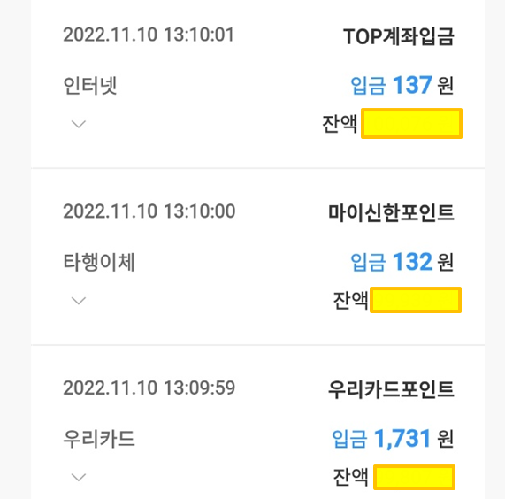 개별적으로 포인트가 입금되는 것을 확인하실 수 있습니다.