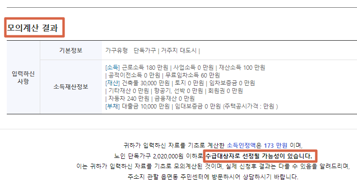 5. 결과보기를 선택하면 입력하신 정보에 따라 기초연금을 받으실 수 있는지 모의 계산 결과를 확인하실 수 있습니다.